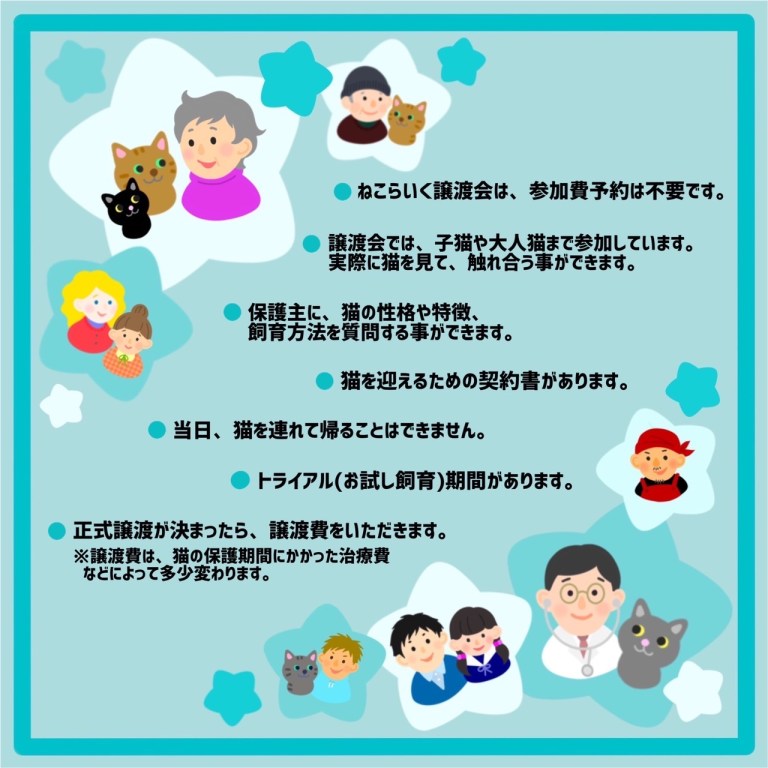 ホーム 1 猫の里親になりませんか?譲渡会を定期的に開催しています TNR活動について チャリティー販売 このリンクから購入でねこらいくへの支援になります。猫たちのごはん代などに活用させていただきます☺ 物資ご支援はこちらから 2021年度 年次報告はこちらをクリック下さい里親募集中(子猫 1才未満)はこちらをクリック2月4日、5日 わんにゃんドーム譲渡会に参加します2月19日(日)13時30分~15時30分 ねこらいく譲渡会 名東生涯学習センターにて開催します2月25日(土)13時30分~15時30分 ねこらいく譲渡会 中村生涯学習センターにて開催します3月12日(日)13時30分~15時30分 ねこらいく譲渡会 名東生涯学習センターにて開催します わんにゃんドーム2023譲渡ボランティア譲渡会に参加します 里親様募集猫はこちらをご覧くださいhttps://nekonetworksub.wordpress.com/ nekolike.satooya 里親募集猫の紹介です★気になったら画像をクリック★ ✧✧ 【名前】ひゃー 【性別】男の子 — 【仮名】いさみ 【年齢】2021/4 【 ⭐️里親募集中⭐️ 【名前】リオン 【名前】ちびスマイル 【性別】女の ☆☆ 【名前】もち麦親方 【性別】男 さらに読み込む Instagram でフォロー nekolike_nenet 🐱ねこらいくの譲渡会のお知らせ🐱 さらに読み込む… フォローお願いします ハンディキャップ猫の譲渡会に参加した猫たちは まだまだ里親さま募集中です!お気軽にお問合せ下さい★ 猫情報はこちらからチェック!! Facebook Twitter Instagram お問合せ